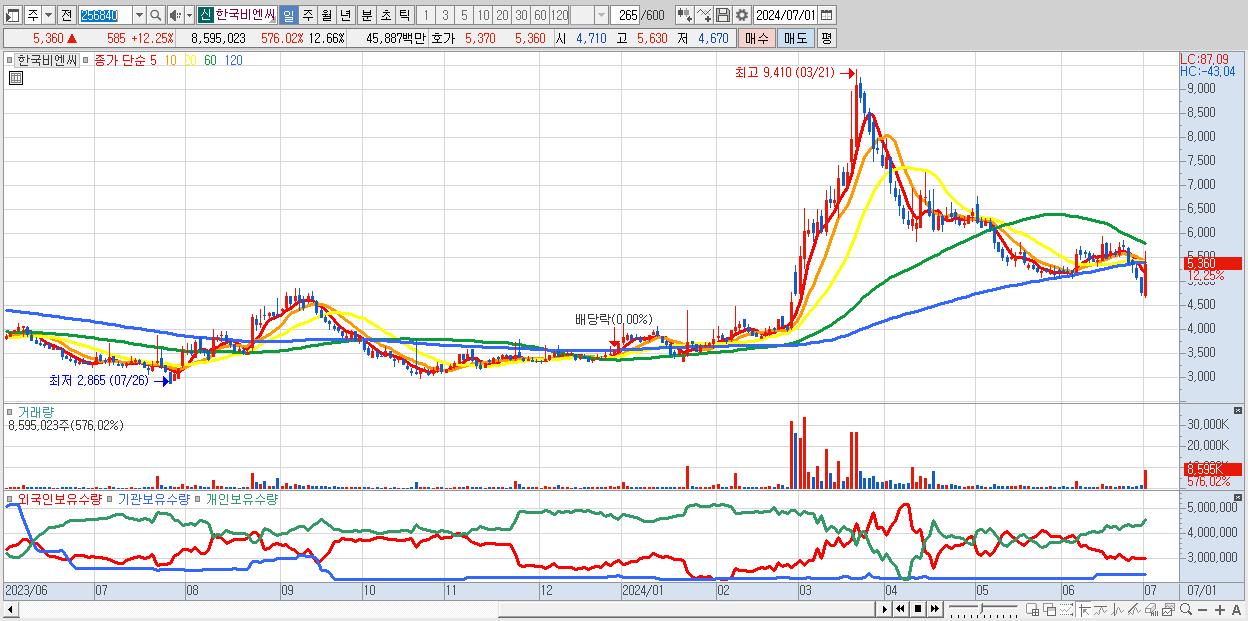 - 한국비엔씨 (5,360원 ▲ 12.25% , 시총: 3,640억, 거래량: 8,595,023, 거래대금:459억)