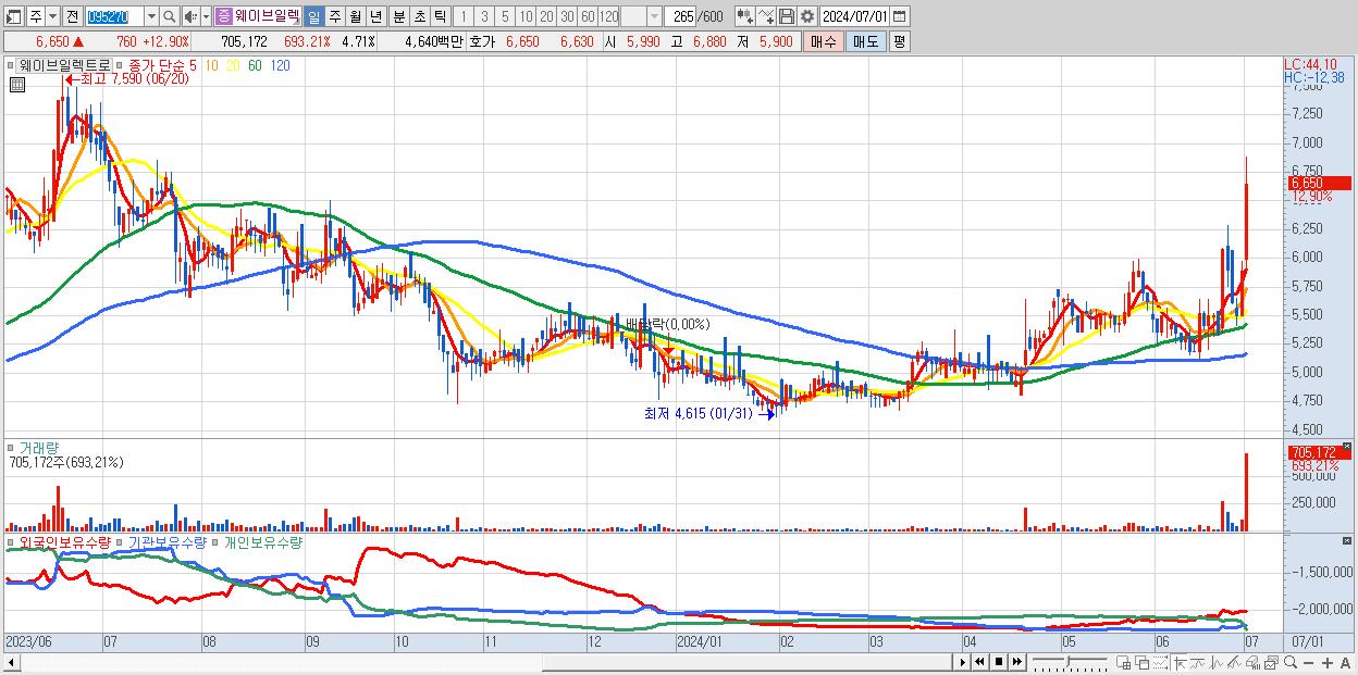 - 웨이브일렉트로 (6,650원 ▲ 12.9% , 시총: 996억, 거래량: 705,172, 거래대금:46억)