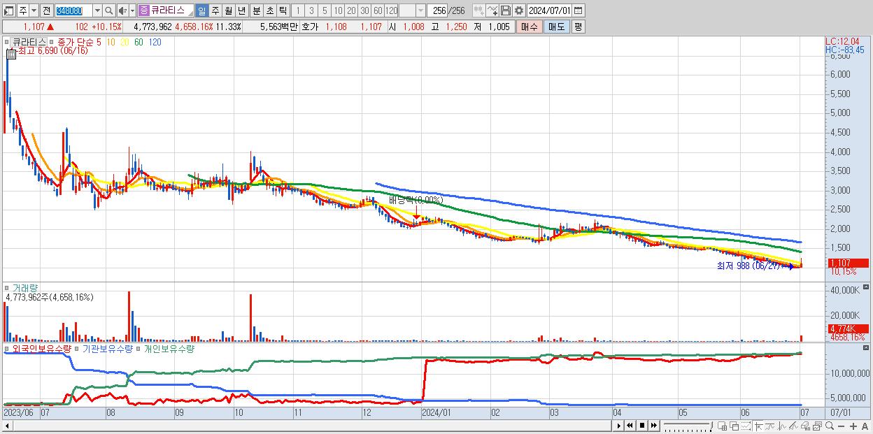 - 큐라티스 (1,107원 ▲ 10.15% , 시총: 467억, 거래량: 4,773,962, 거래대금:56억)