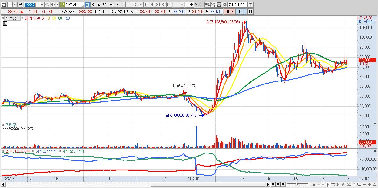 - 삼성생명 (88,500원 ▲ 1.14% , 시총: 177,000억, 외국인 순매수 거래금:77억)
