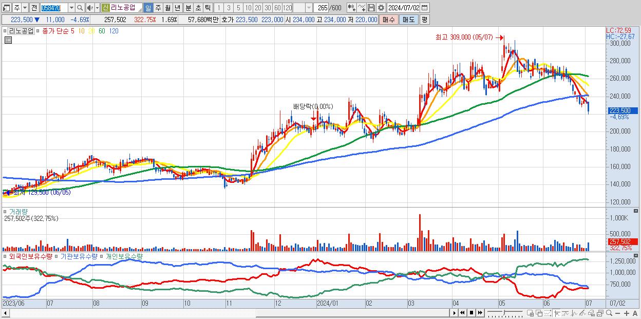 - 리노공업 (223,500원 ▼ -4.69% , 시총: 34,067억, 외국인 순매수 거래금:119억)