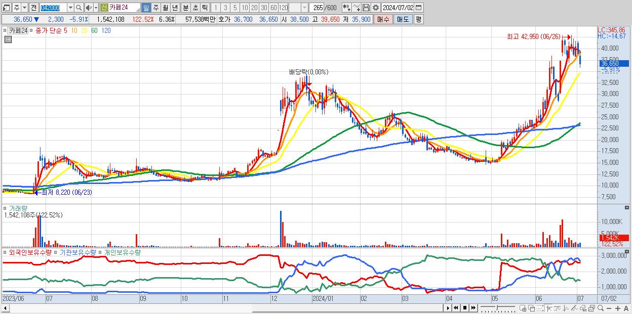 - 카페24 (36,650원 ▼ -5.91% , 시총: 8,889억, 외국인 순매수 거래금:62억)
