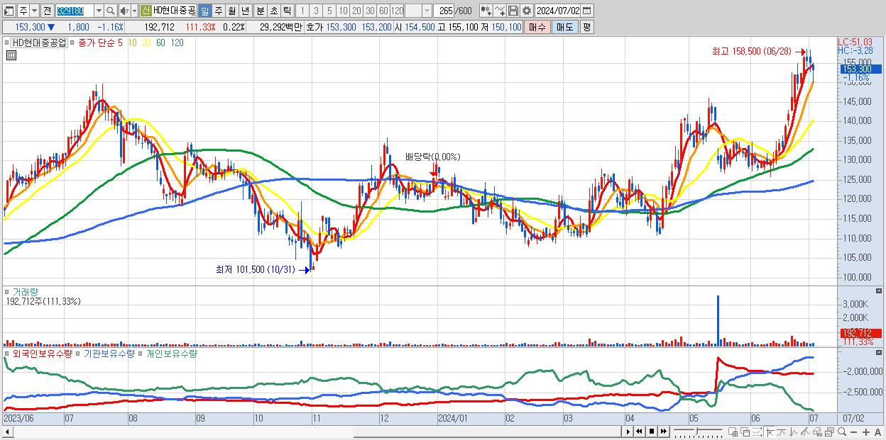 - HD현대중공업 (153,300원 ▼ -1.16% , 시총: 136,089억, 외국인 순매수 거래금:63억)