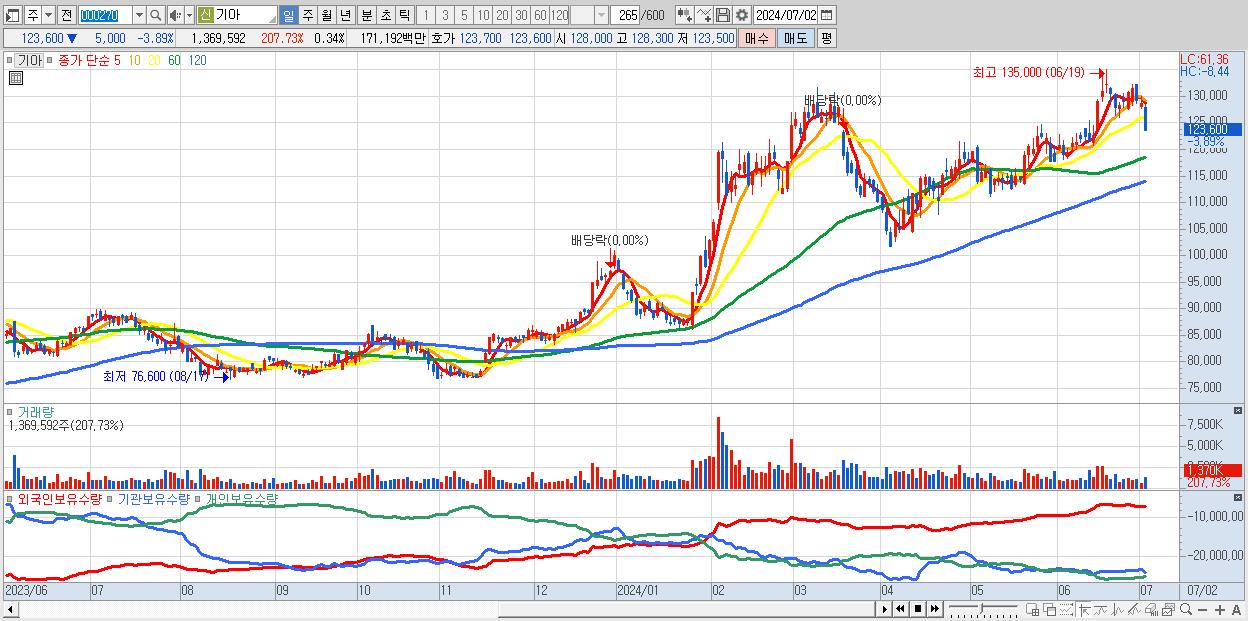 - 기아 (123,600원 ▼ -3.89% , 시총: 494,225억, 거래량: 1,369,592, 거래대금:1,712억)