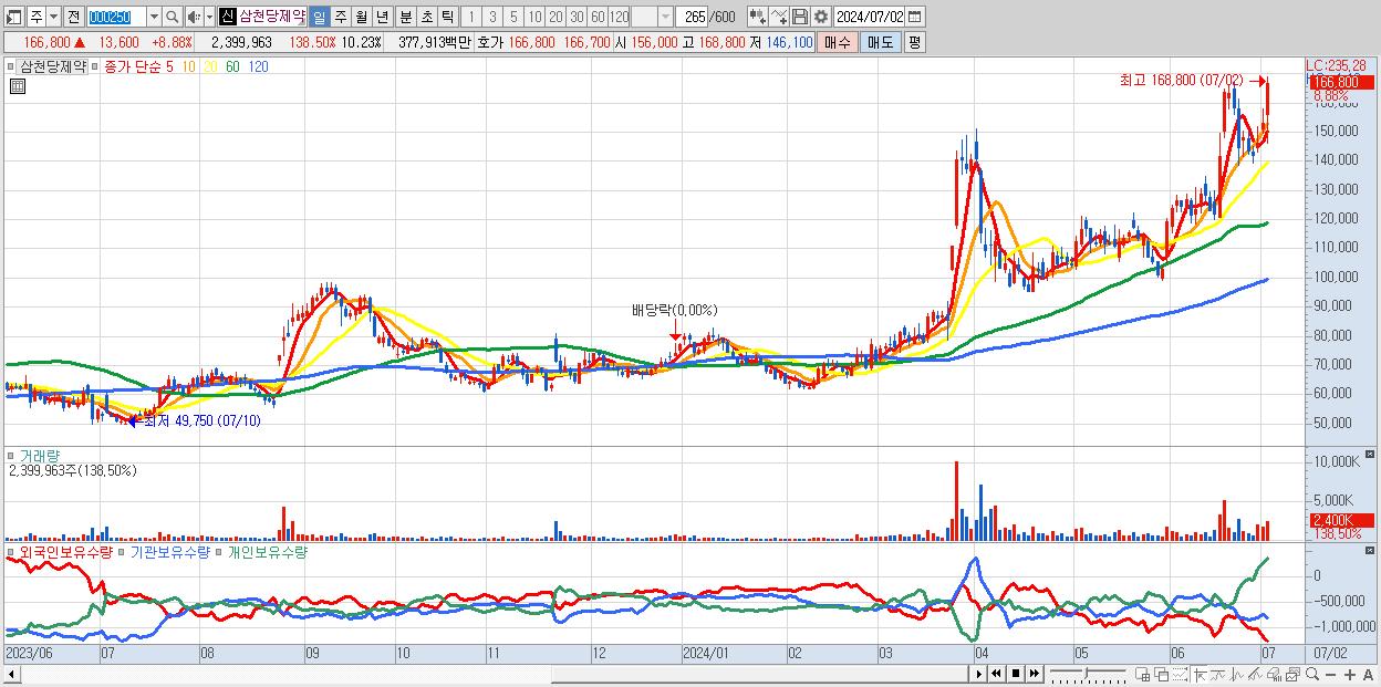 - 삼천당제약 (166,800원 ▲ 8.88% , 시총: 39,127억, 거래량: 2,399,963, 거래대금:3,779억)