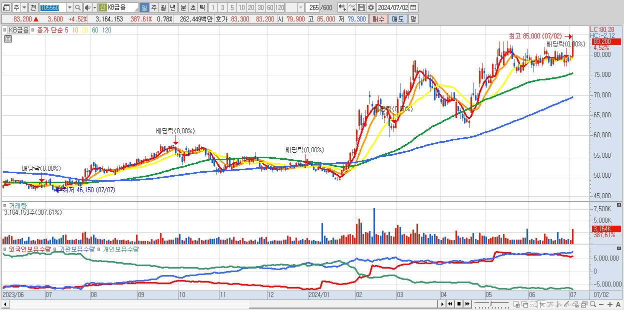 - KB금융 (83,200원 ▲ 4.52% , 시총: 335,721억, 거래량: 3,164,153, 거래대금:2,624억)