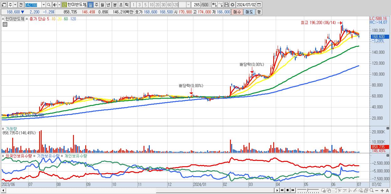 - 한미반도체 (168,600원 ▼ -1.29% , 시총: 163,531억, 거래량: 858,735, 거래대금:1,462억)