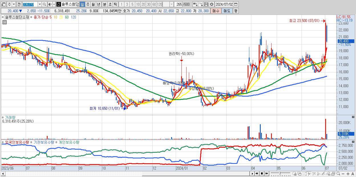 - 솔루스첨단소재 (20,400원 ▼ -11.5% , 시총: 14,324억, 거래량: 6,318,491, 거래대금:1,348억)