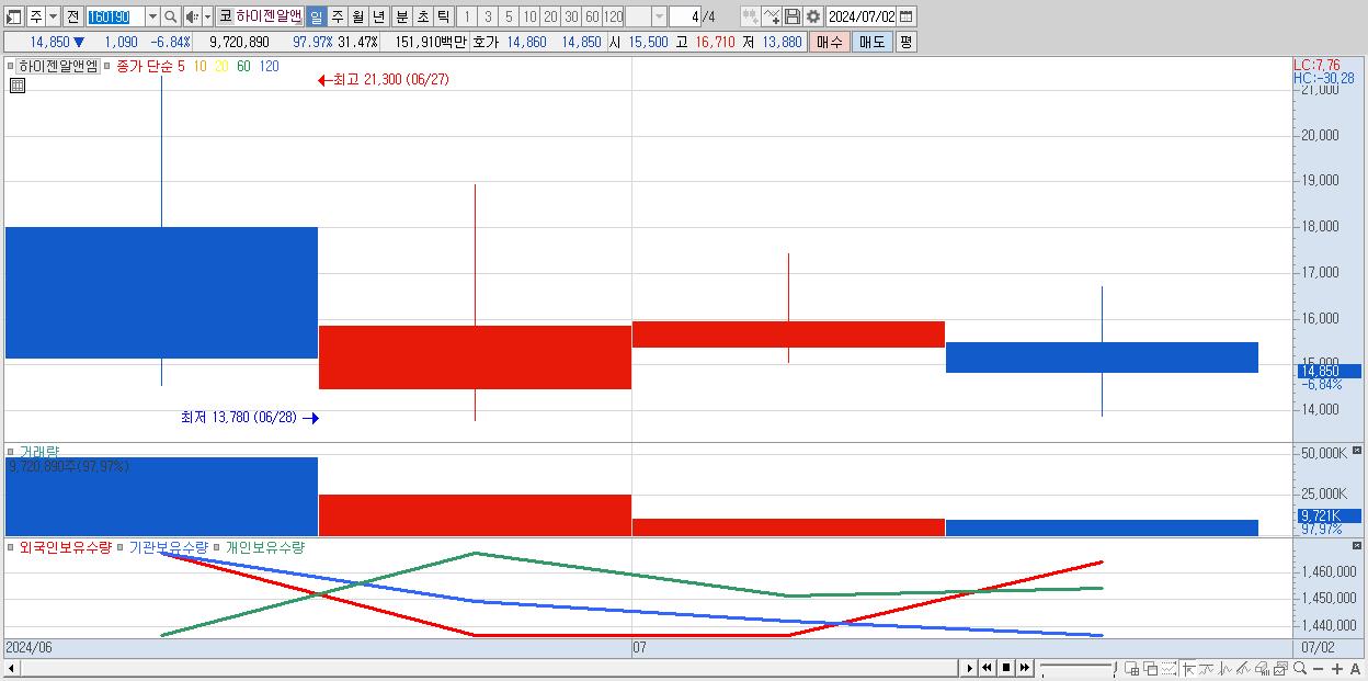 - 하이젠알앤엠 (14,850원 ▼ -6.84% , 시총: 4,587억, 거래량: 9,720,890, 거래대금:1,519억)