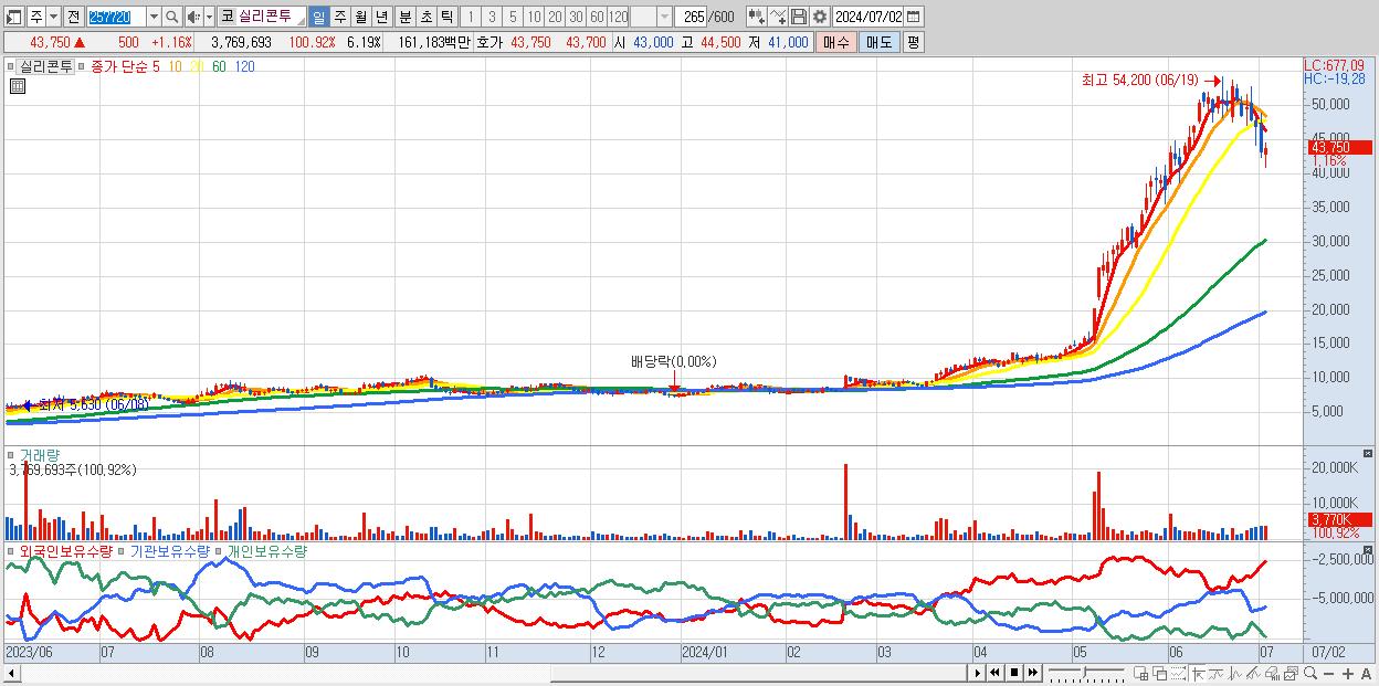 - 실리콘투 (43,750원 ▲ 1.16% , 시총: 26,632억, 거래량: 3,769,693, 거래대금:1,612억)