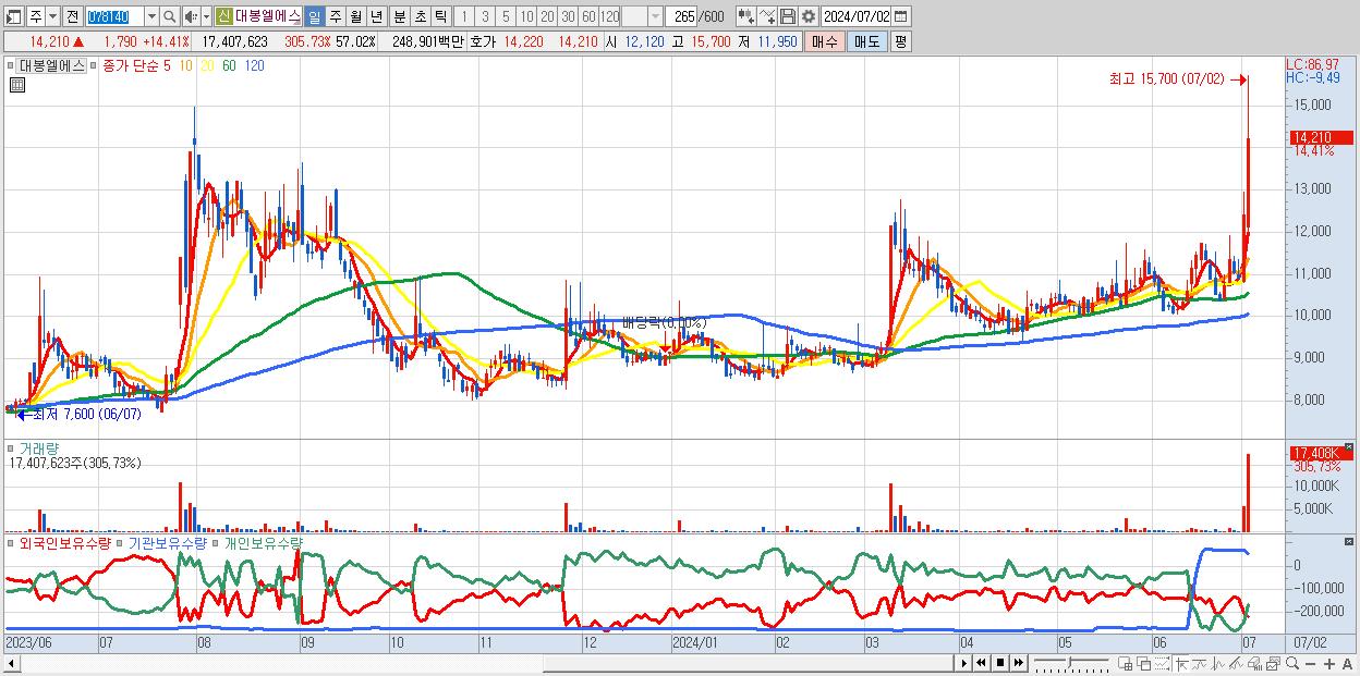 - 대봉엘에스 (14,210원 ▲ 14.41% , 시총: 1,575억, 거래량: 17,407,623, 거래대금:2,489억)