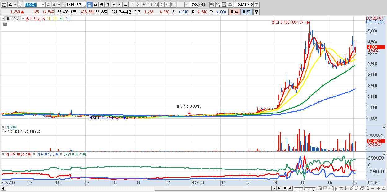 - 대원전선 (4,260원 ▲ 4.54% , 시총: 3,194억, 거래량: 62,402,125, 거래대금:2,717억)
