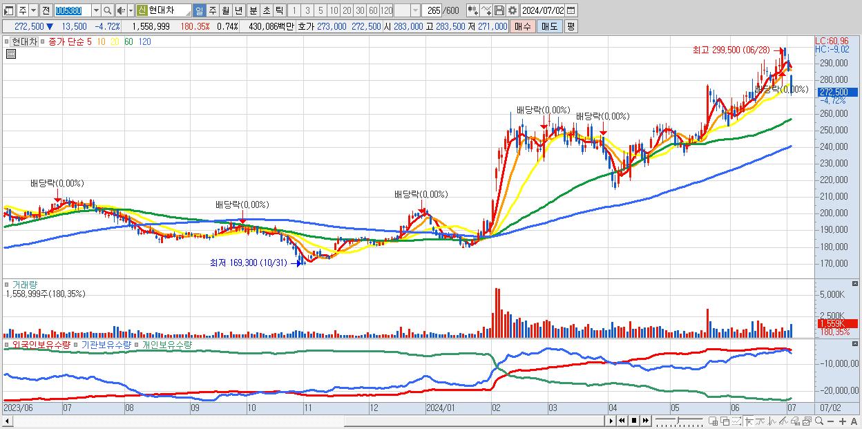 - 현대차 (272,500원 ▼ -4.72% , 시총: 570,659억, 거래량: 1,558,999, 거래대금:4,301억)