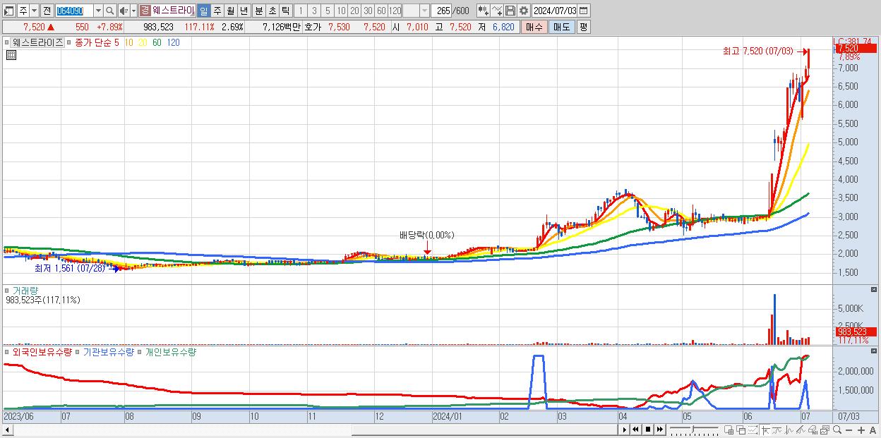 - 웨스트라이즈 (7,520원 ▲ 7.89% , 시총: 2,747억, 거래량: 983,523, 거래대금:71억, KOSDAQ)