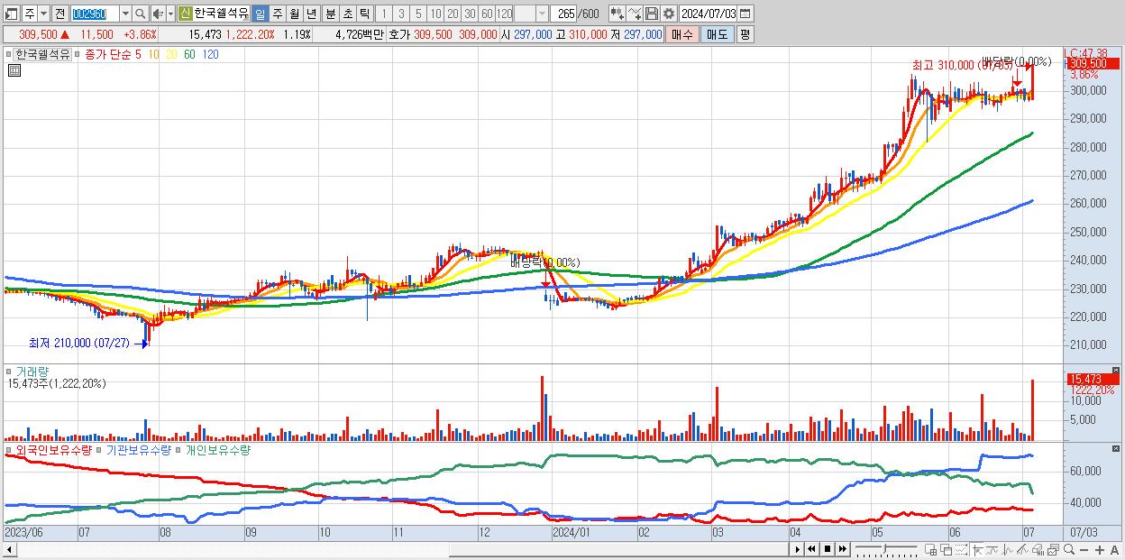 - 한국쉘석유 (309,500원 ▲ 3.86% , 시총: 4,024억, 거래량: 15,473, 거래대금:47억, KOSPI)