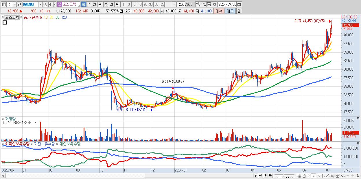 - 오스코텍 (42,900원 ▲ 2.14% , 시총: 16,299억, 거래량: 1,172,068, 거래대금:506억, KOSDAQ)