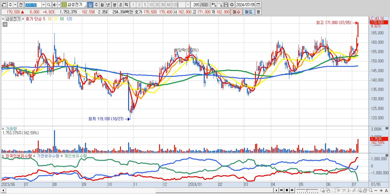- 삼성전기 (170,500원 ▲ 4.92% , 시총: 127,353억, 거래량: 1,755,057, 거래대금:2,947억, KOSPI)