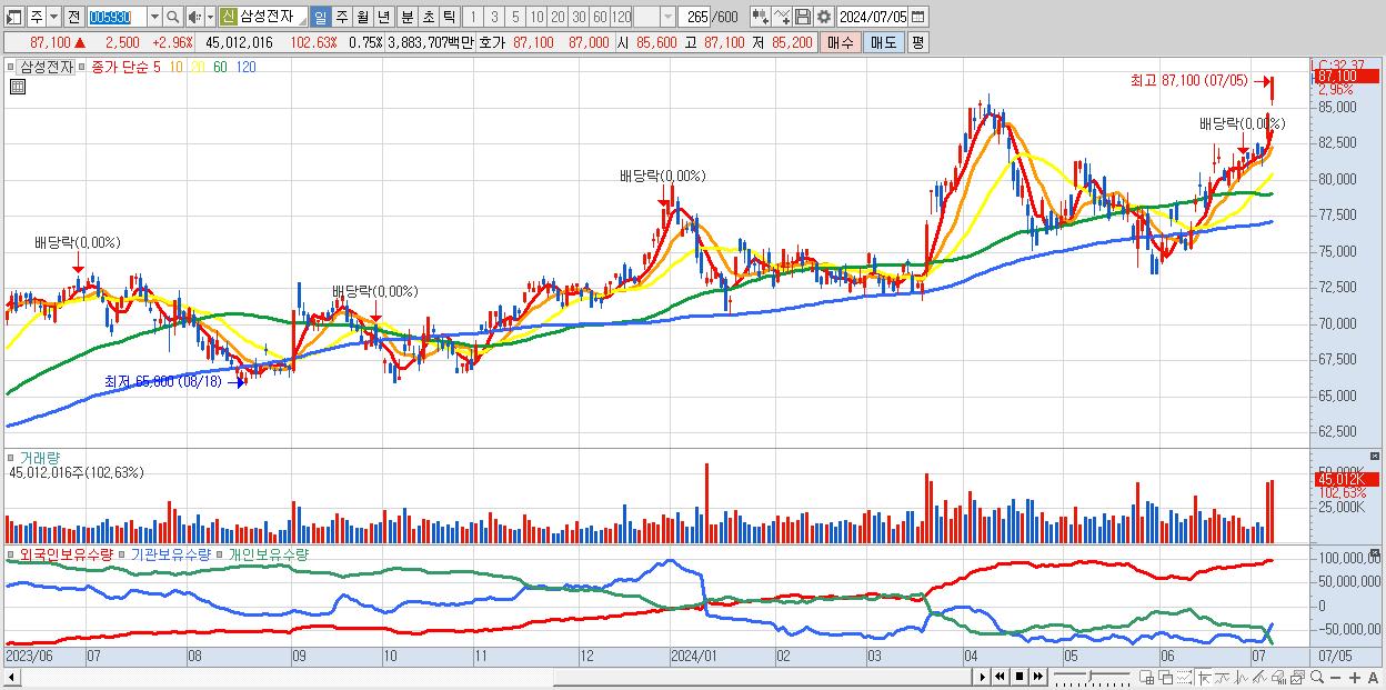 - 삼성전자 (87,100원 ▲ 2.96% , 시총: 5,199,681억, 거래량: 45,663,839, 거래대금:39,402억, KOSPI)