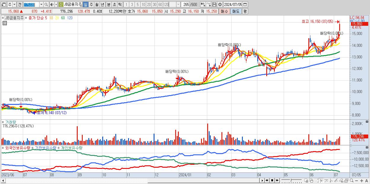 - JB금융지주 (15,860원 ▲ 4.41% , 시총: 30,940억, 거래량: 776,296, 거래대금:123억, KOSPI)