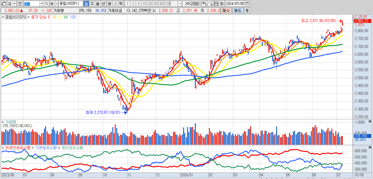 | 07/05 | 2,862.23 | ▲1.32% | -25,147억 | 13,086억 | 12,560억 | -499억 |