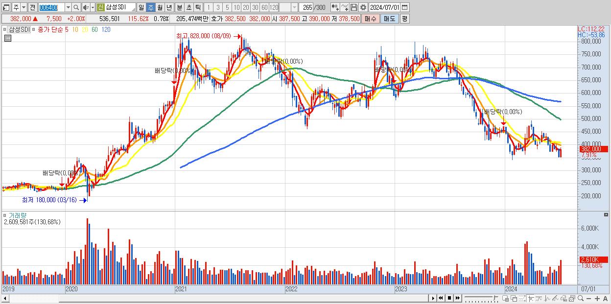 - 삼성SDI (382,000원 ▲ 7.91% , 시총: 262,681억, 거래량: 2,609,581, 거래대금:9,575억)