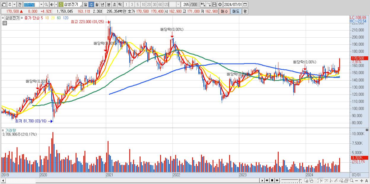 - 삼성전기 (170,500원 ▲ 7.91% , 시총: 127,353억, 거래량: 3,706,986, 거래대금:6,036억)