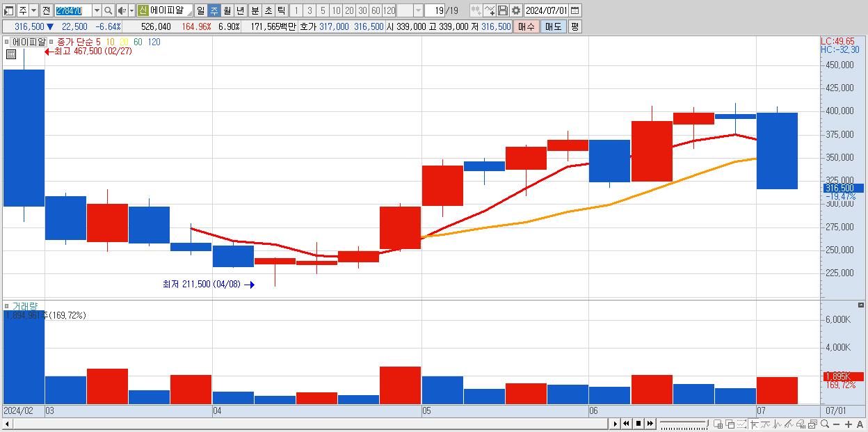 - 에이피알 (316,500원 ▼ -19.47% , 시총: 24,118억, 거래량: 1,894,961, 거래대금:6,628억)