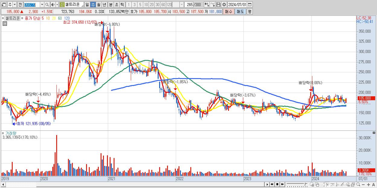 - 셀트리온 (185,800원 ▲ 6.6% , 시총: 403,173억, 거래량: 3,365,139, 거래대금:6,156억)