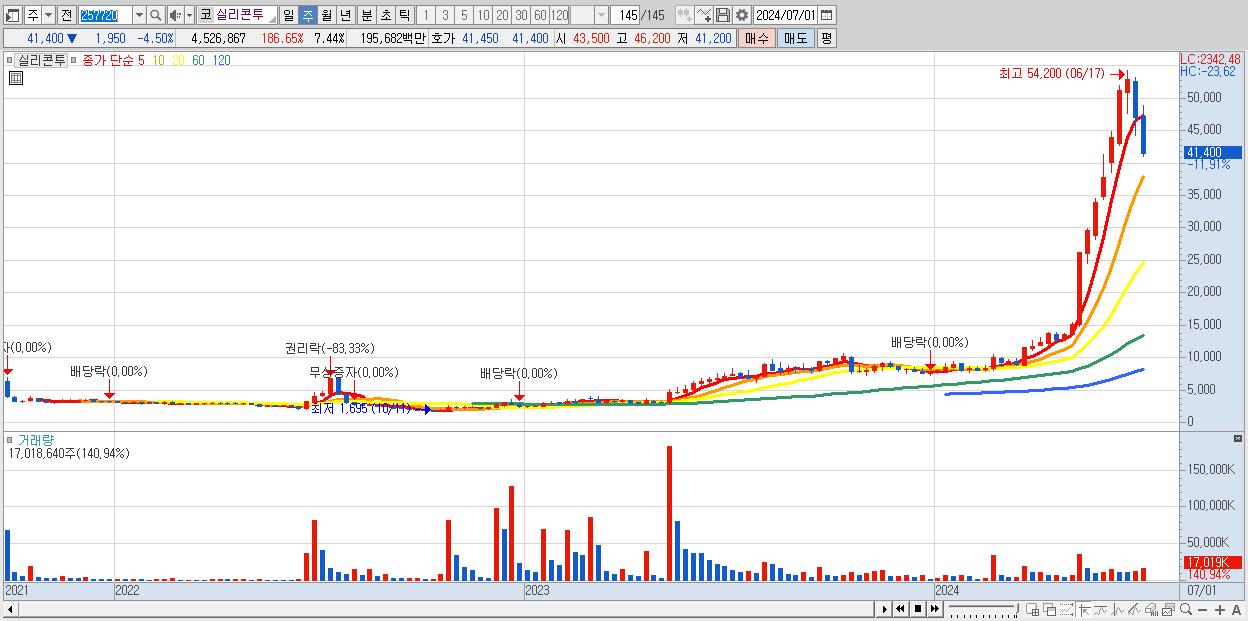 - 실리콘투 (41,400원 ▼ -11.91% , 시총: 25,202억, 거래량: 17,018,640, 거래대금:7,425억)
