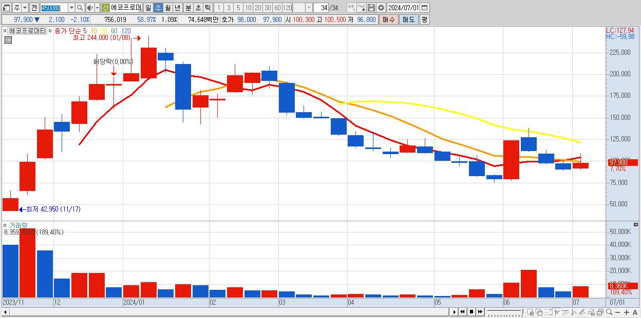 - 에코프로머티 (97,900원 ▲ 7.7% , 시총: 67,620억, 거래량: 8,359,703, 거래대금:8,400억)