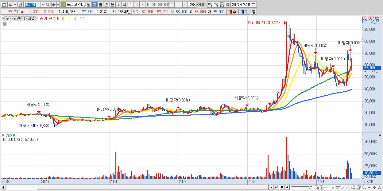 - 포스코인터내셔널 (57,700원 ▼ -11.77% , 시총: 101,507억, 거래량: 10,860,576, 거래대금:6,470억)