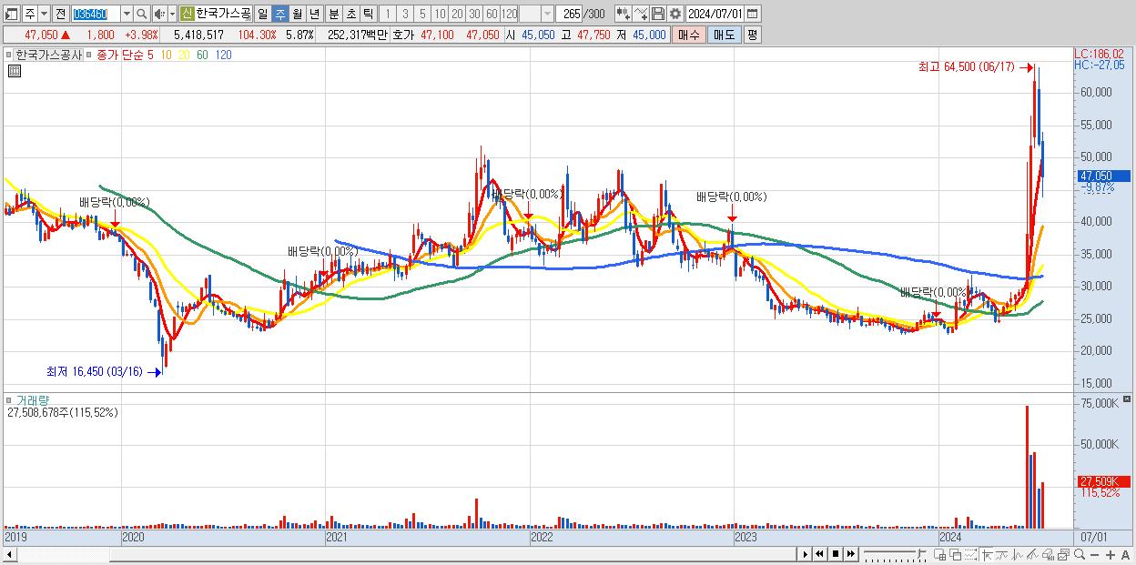 - 한국가스공사 (47,050원 ▼ -9.87% , 시총: 43,433억, 거래량: 27,508,678, 거래대금:13,109억)