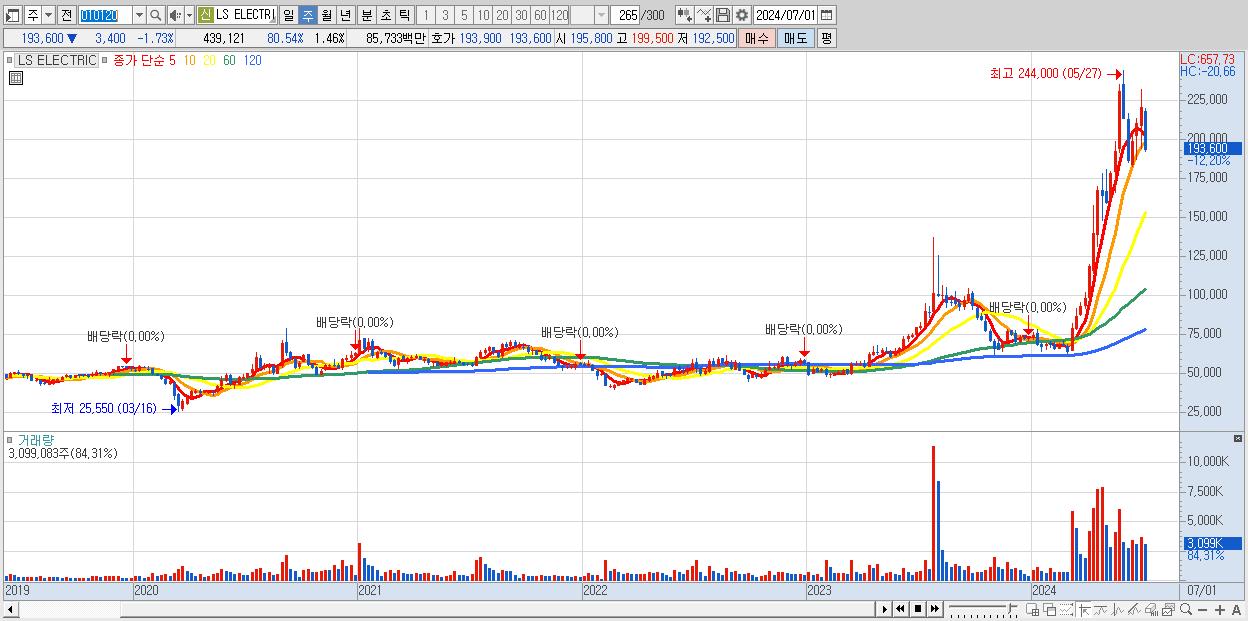 - LS ELECTRIC (193,600원 ▼ -12.2% , 시총: 58,080억, 거래량: 3,099,083, 거래대금:6,338억)