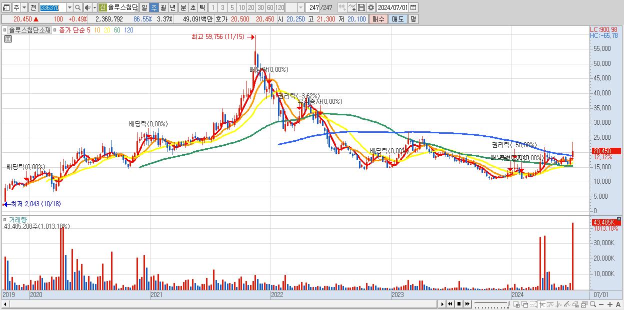 - 솔루스첨단소재 (20,450원 ▲ 12.12% , 시총: 14,359억, 거래량: 43,485,208, 거래대금:9,293억)
