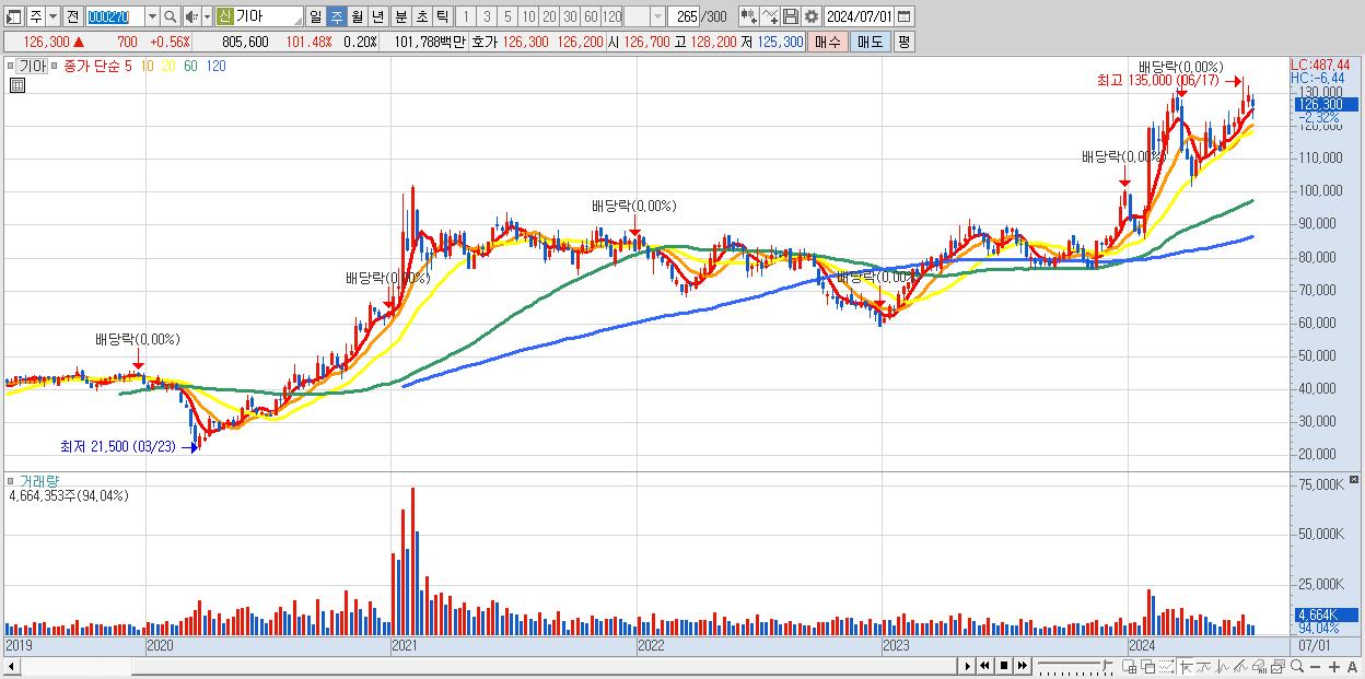 - 기아 (126,300원 ▼ -2.32% , 시총: 505,021억, 거래량: 4,664,353, 거래대금:5,853억)