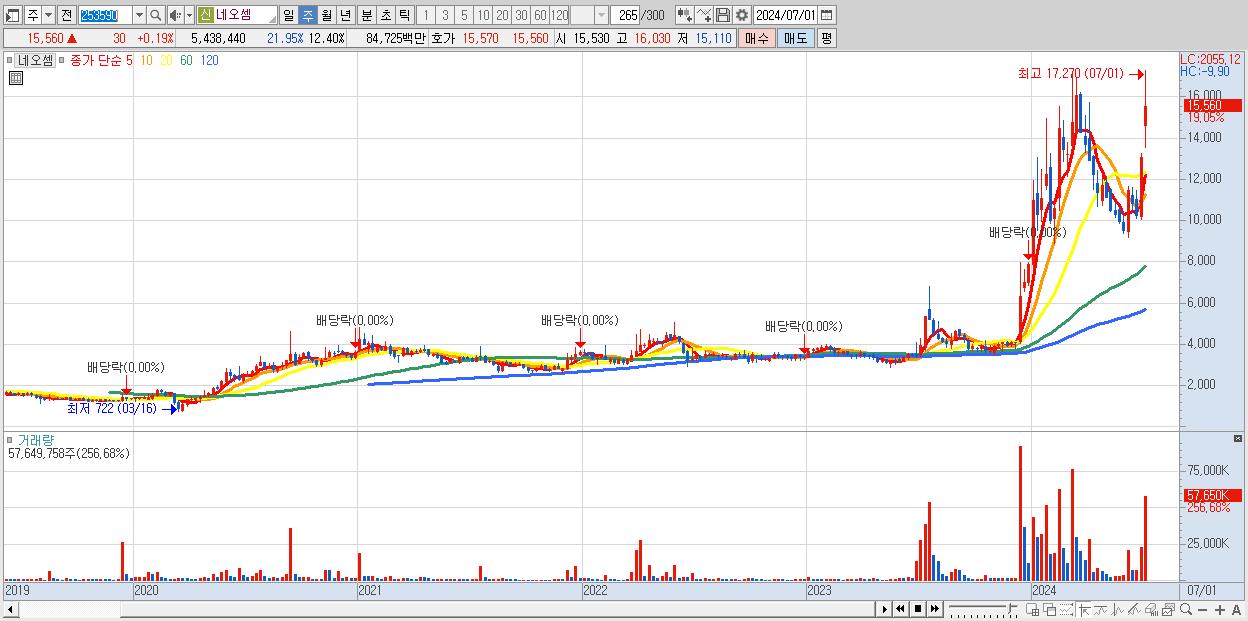 - 네오셈 (15,560원 ▲ 19.05% , 시총: 6,826억, 거래량: 57,649,758, 거래대금:8,916억)