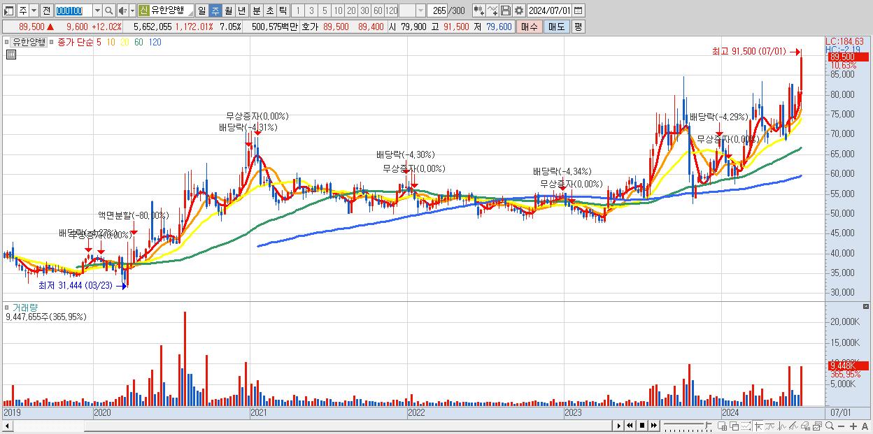- 유한양행 (89,500원 ▲ 10.63% , 시총: 71,787억, 거래량: 9,447,655, 거래대금:8,053억)