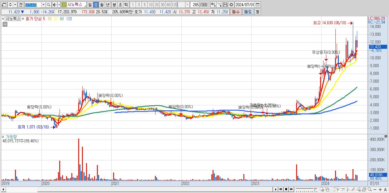 - 시노펙스 (11,420원 ▼ -6.78% , 시총: 9,572억, 거래량: 48,015,737, 거래대금:5,935억)