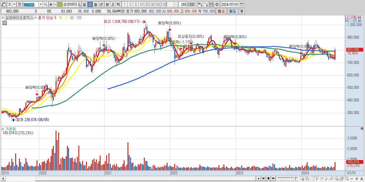 - 삼성바이오로직스 (803,000원 ▲ 10.45% , 시총: 571,527억, 거래량: 749,874, 거래대금:5,905억)