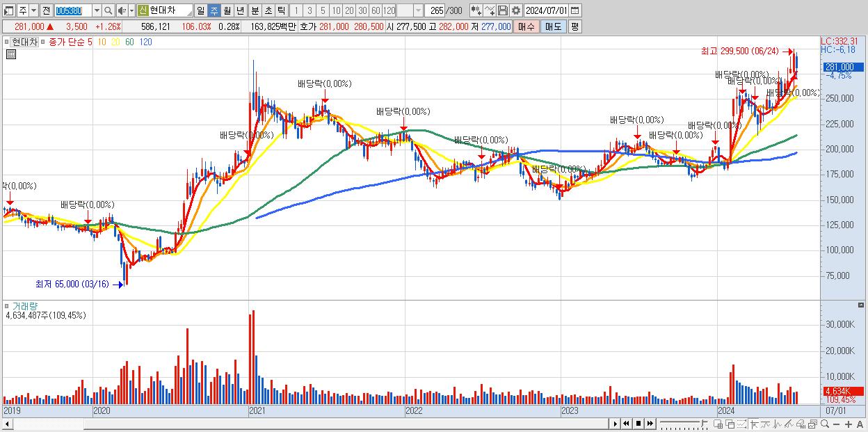 - 현대차 (281,000원 ▼ -4.75% , 시총: 588,459억, 거래량: 4,634,487, 거래대금:12,931억)