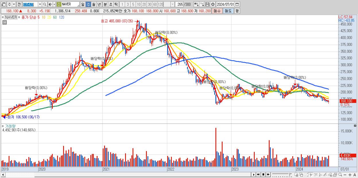 - NAVER (168,100원 ▲ 0.72% , 시총: 273,009억, 거래량: 4,492,901, 거래대금:7,299억)
