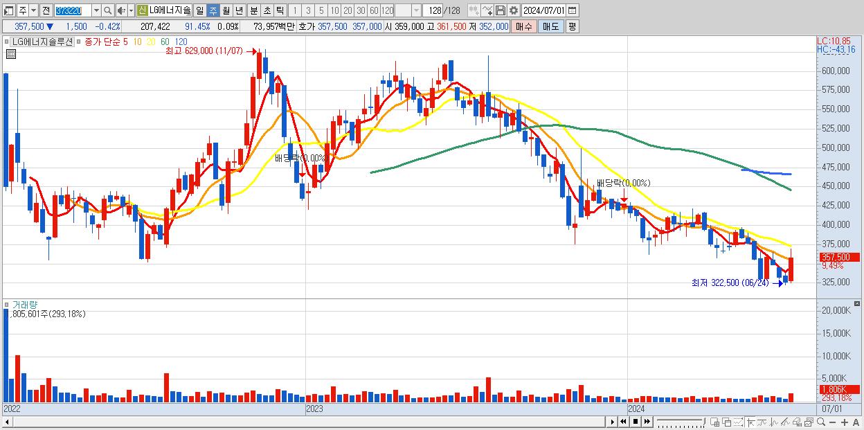 - LG에너지솔루션 (357,500원 ▲ 9.49% , 시총: 836,550억, 거래량: 1,805,601, 거래대금:6,407억)