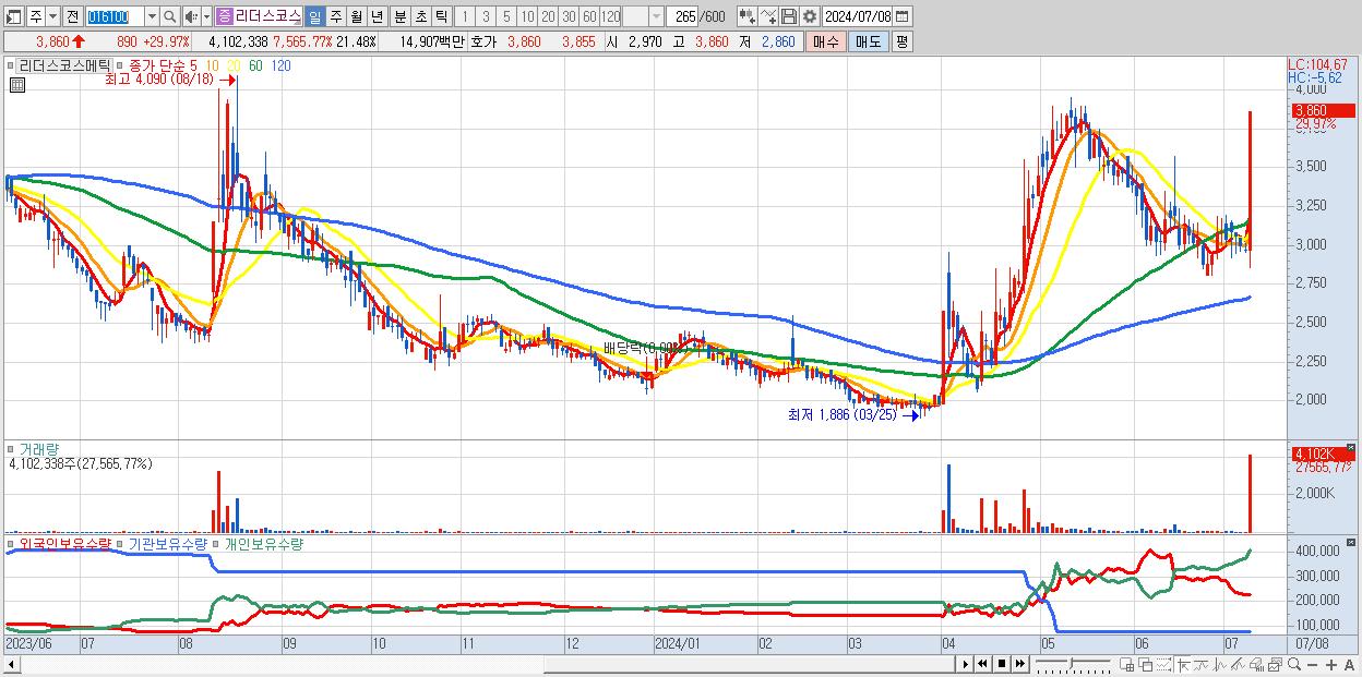 - 리더스코스메틱 (3,860원 ▲ 29.97% , 시총: 737억, 거래량: 4,102,338, 거래대금:149억)