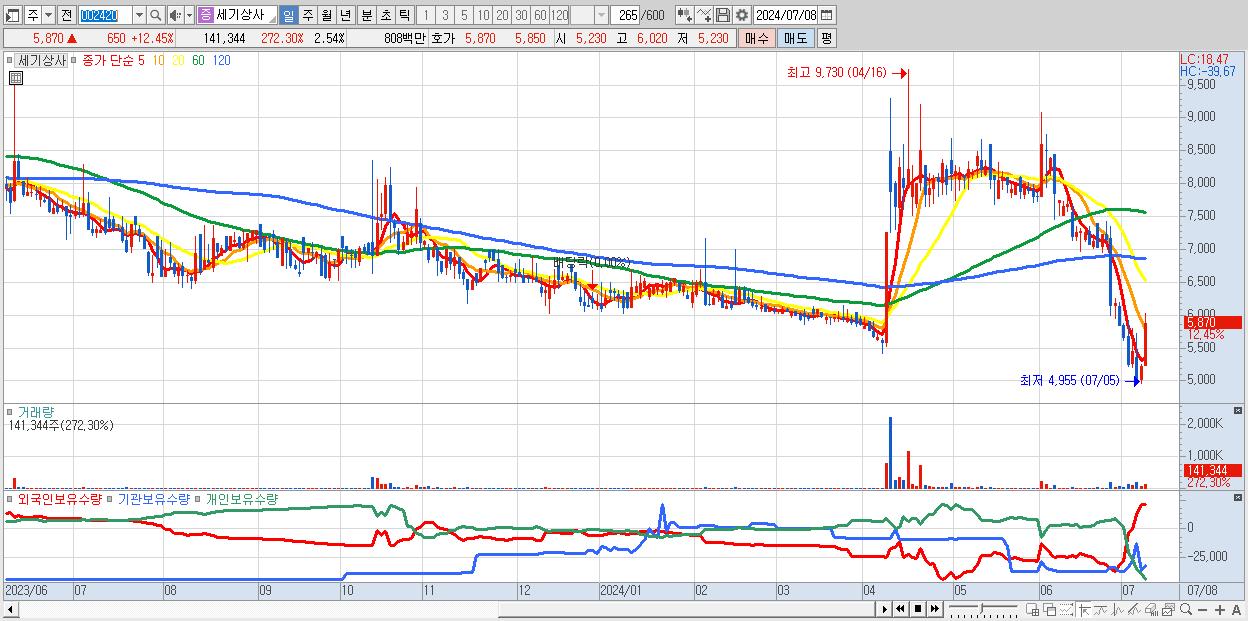 - 세기상사 (5,870원 ▲ 12.45% , 시총: 326억, 거래량: 141,344, 거래대금:8억)