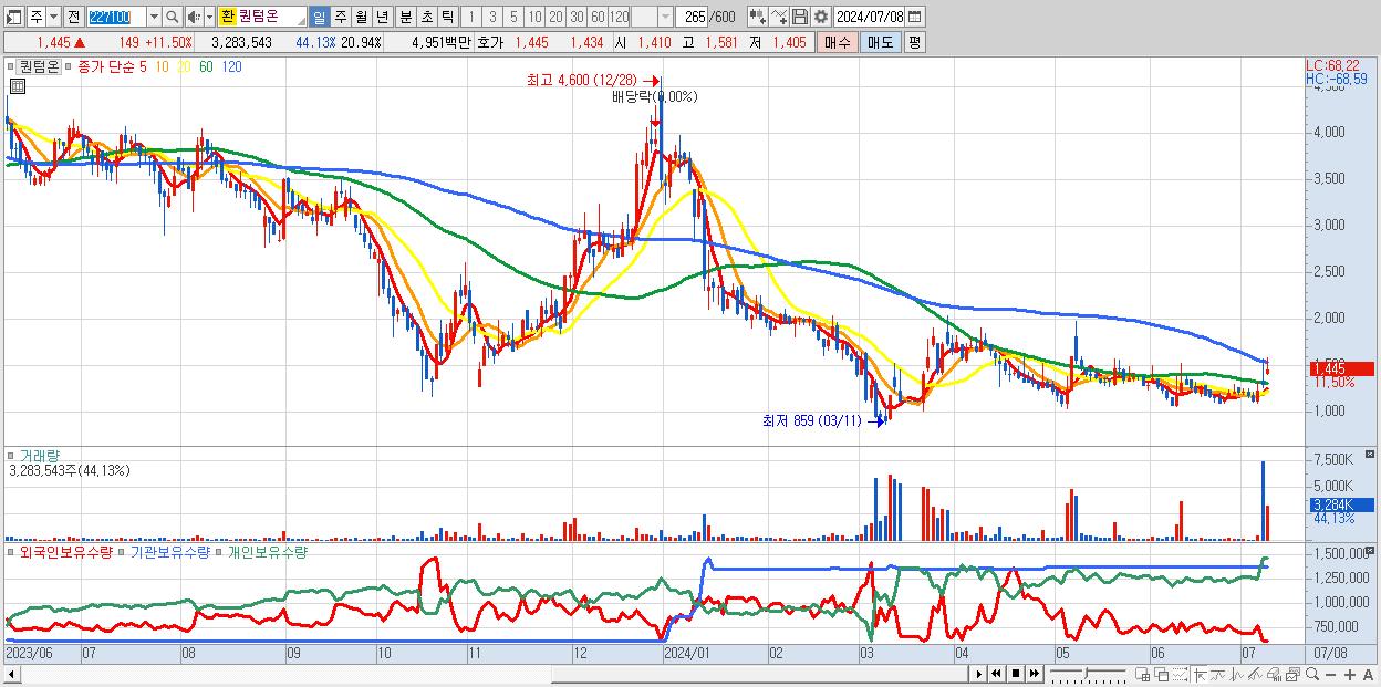 - 퀀텀온 (1,445원 ▲ 11.5% , 시총: 227억, 거래량: 3,283,543, 거래대금:50억)