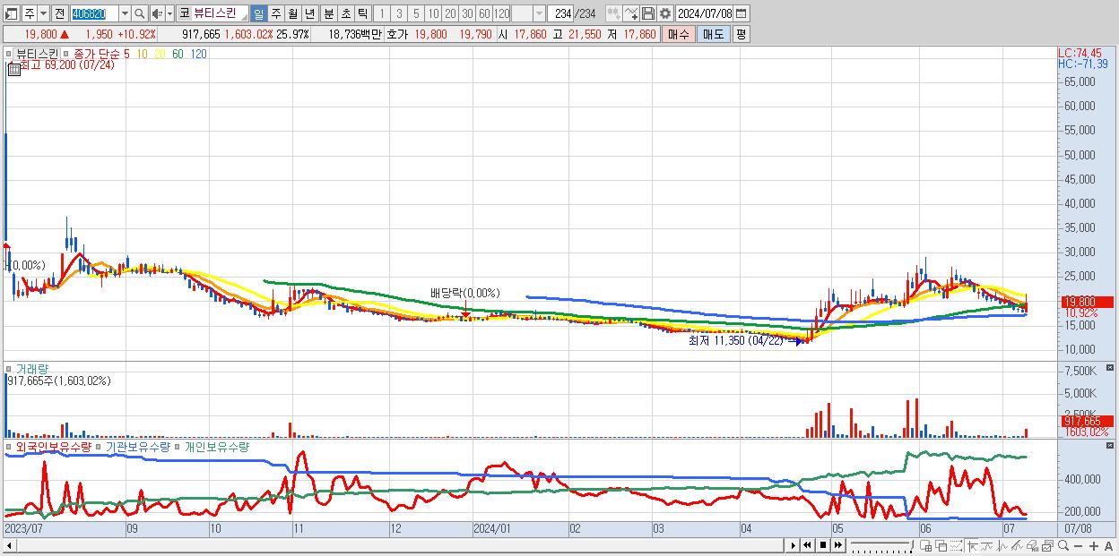 - 뷰티스킨 (19,800원 ▲ 10.92% , 시총: 700억, 거래량: 917,665, 거래대금:187억)