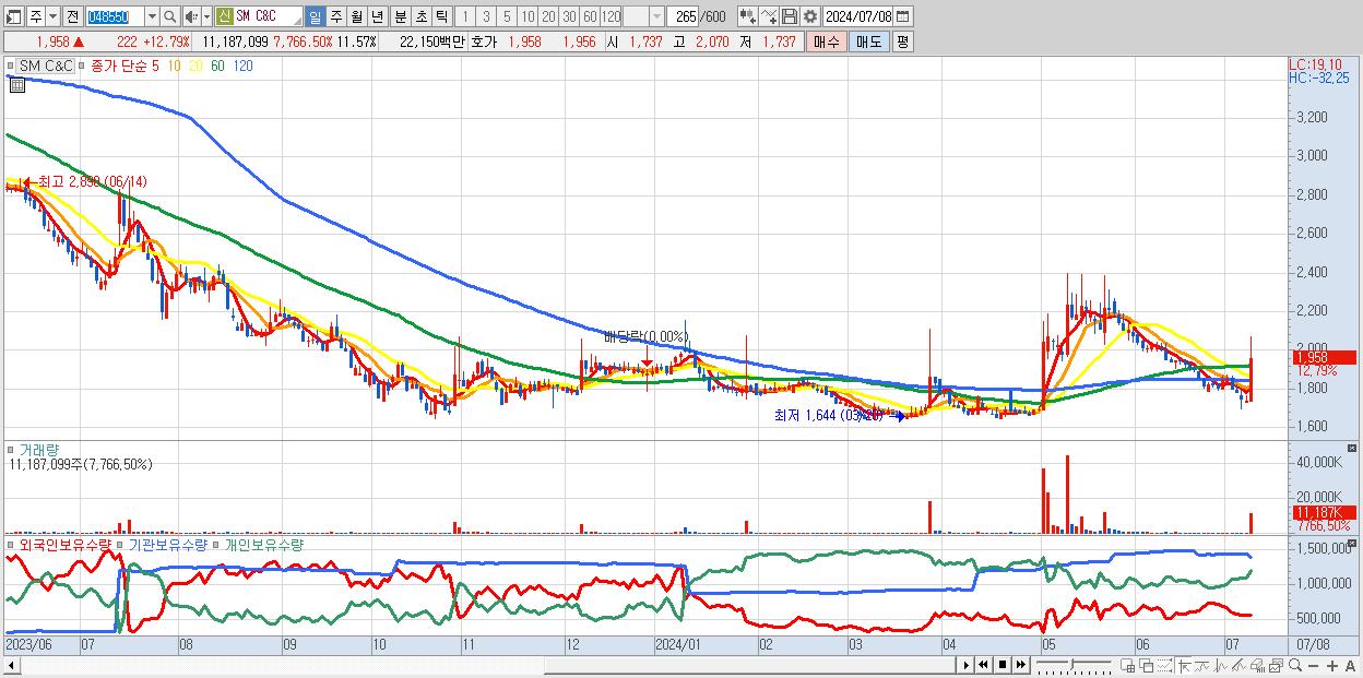 - SM C&C (1,958원 ▲ 12.79% , 시총: 1,894억, 거래량: 11,187,099, 거래대금:222억)