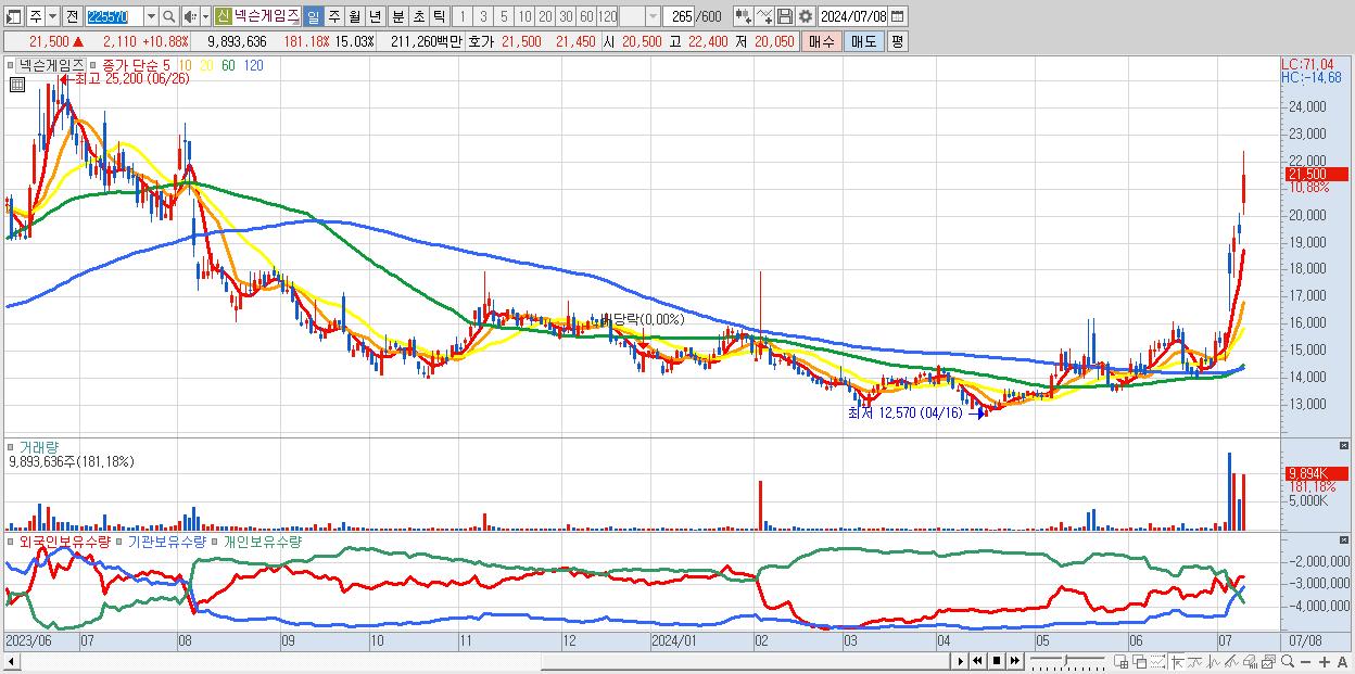 - 넥슨게임즈 (21,500원 ▲ 10.88% , 시총: 14,152억, 거래량: 9,893,636, 거래대금:2,113억)