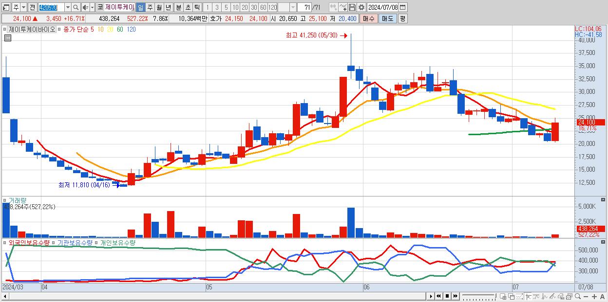 - 제이투케이바이오 (24,100원 ▲ 16.71% , 시총: 1,343억, 거래량: 438,264, 거래대금:104억)