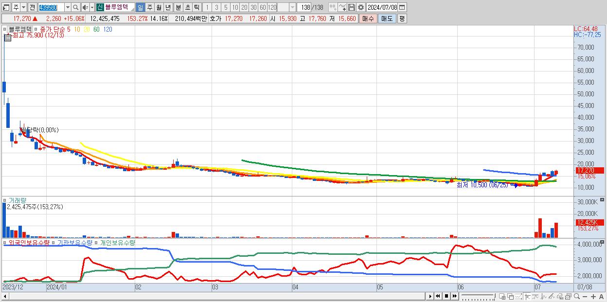 - 블루엠텍 (17,270원 ▲ 15.06% , 시총: 1,880억, 거래량: 12,425,475, 거래대금:2,105억)